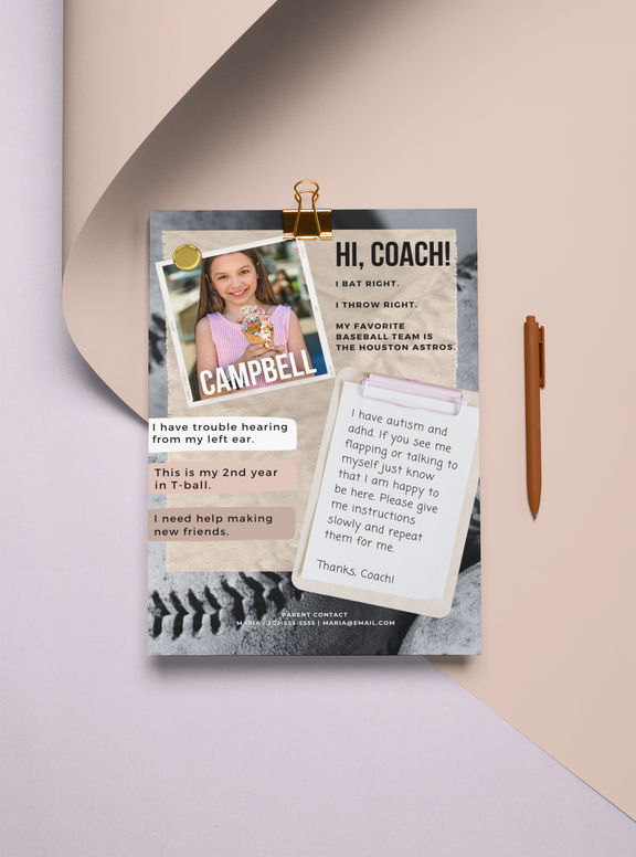 A quick and customizable way to introduce your child and their unique needs, whether it be a teacher, coach, doctor or any care provider in between. Template includes sample information to get you started written by two moms who both have children with disabilities.