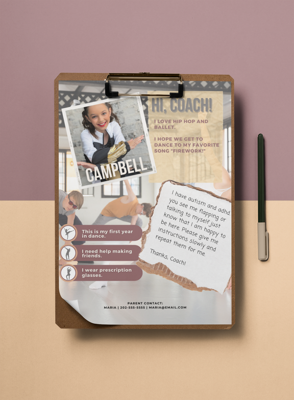 A quick and customizable way to introduce your child and their unique needs, whether it be a teacher, coach, doctor or any care provider in between. Template includes sample information to get you started written by two moms who both have children with disabilities.