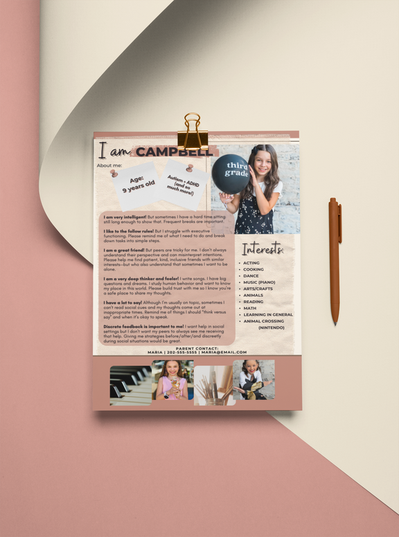 A quick and customizable way to introduce your child and their unique needs, whether it be a teacher, coach, doctor or any care provider in between. Template includes sample information to get you started written by two moms who both have children with disabilities.