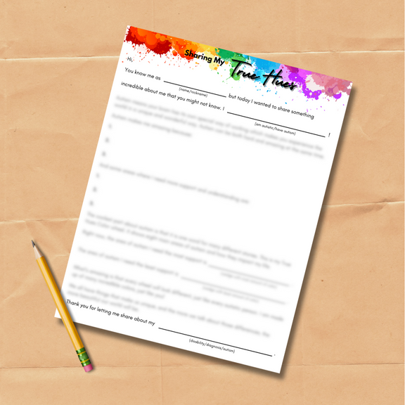 Upon completion of the True Hues Color Wheel: an activity to better understand autism, a child can use this guided form to share their True Hues with classmates, family members, or their community. Using neurodiversity-affirming language, Sharing My True Hues provides an opportunity for self-reflection, reinforcement of the activity, and also is a great source of education for those committed to learning more about autism.